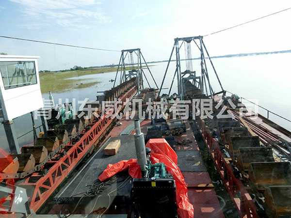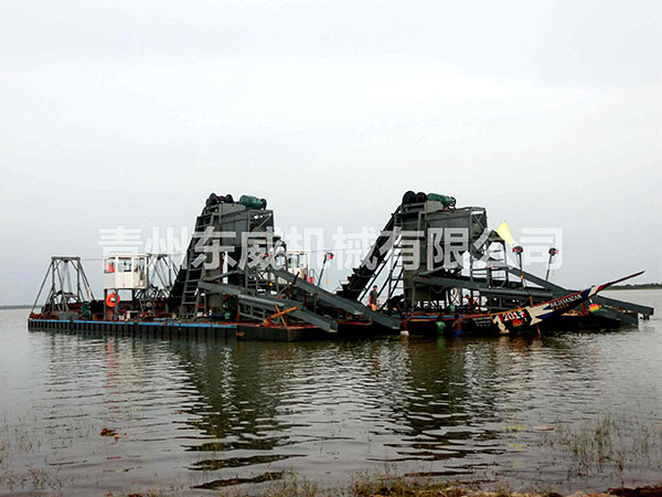 淘金船是一種集采礦作業(yè)、選礦作業(yè)為一體的水上聯(lián)合工廠,是一種砂金、鐵粉、錫礦、鎢礦等重金屬開采設(shè)備,它包括鏈斗挖掘系統(tǒng)、選礦及供水系統(tǒng)、廢礦及尾礦排棄系統(tǒng)、甲板機械、船體、上部鋼構(gòu)、供電等幾個基本系統(tǒng)。